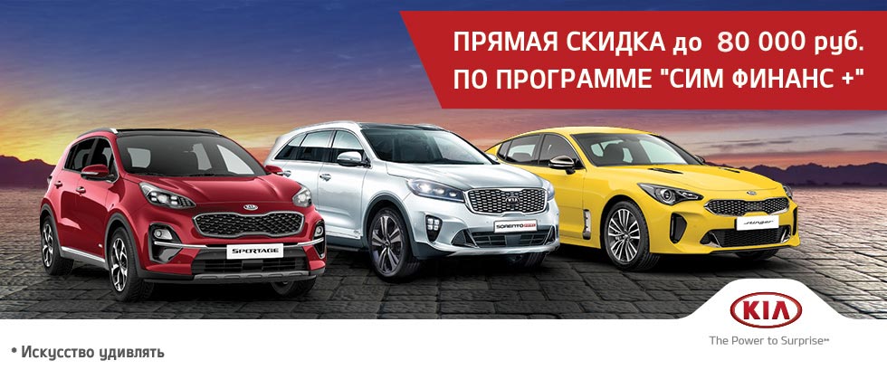 Приобретая Kia по программе "СИМ финанс+" вы получаете прямую скидку на автомобиль до 80 000 руб.: